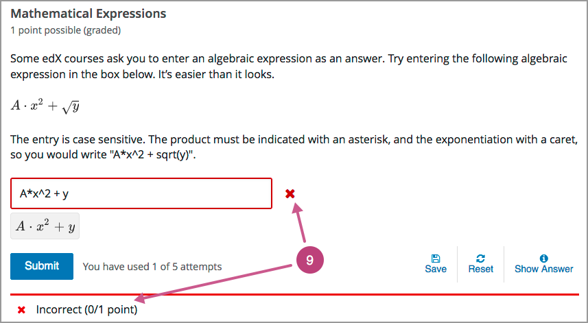 Rendered answer. For some problem types, the LMS uses MathJax to render plain text as “beautiful math.”